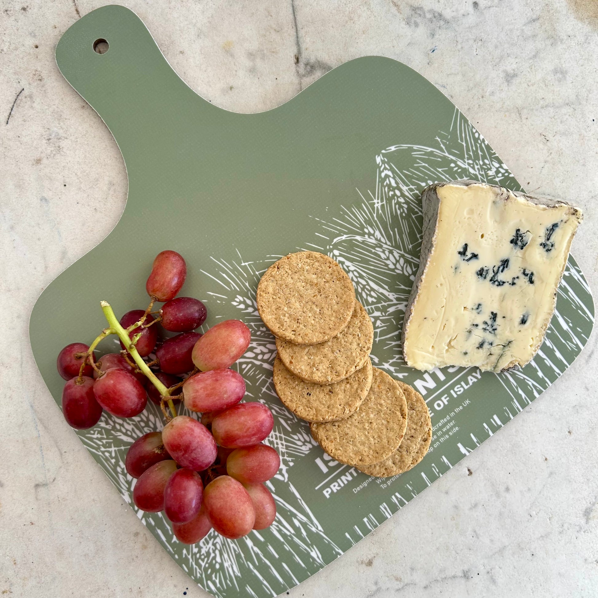Perfect for serving cheese, bread, snacks each melamine board measures 292 x 243mm and withstands temperatures of 160C. We recommend you chop on the reverse in order to protect the design and have added a bespoke reverse design in our Islay Prints signature green.
