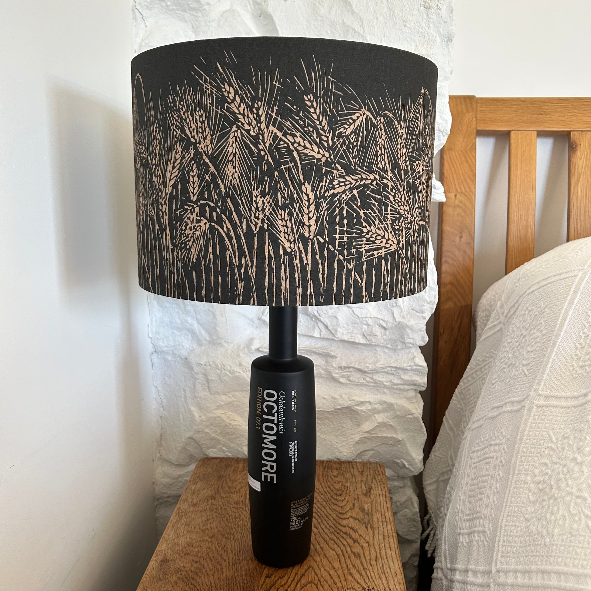 This lampshade is handmade using bespoke fabric designed by us based on our linoprint of a field of barley. Inspired by Islay's rich whisky heritage, barley is the key ingredient that creates our world famous spirit.