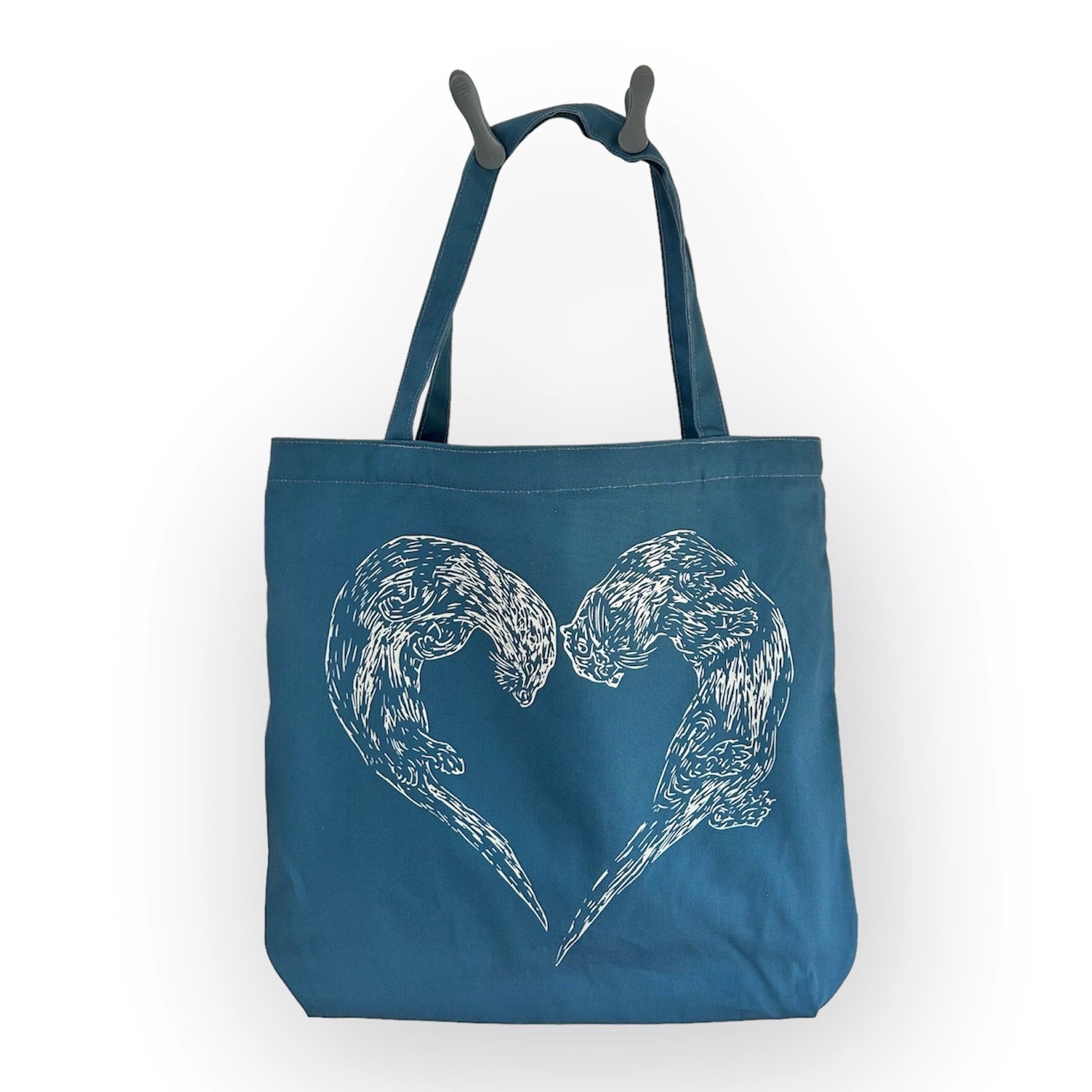 Our beautiful swimming otters design has been used to make this large roomy tote bag. Perfect for taking to the beach full of towels or doing the weekly shop! Mix it up by turning it inside out for a different look. Taken from our original linocut otter design this would make the perfect gift for anyone that loves the sea and these beautiful creatures, or a special gift to yourself.