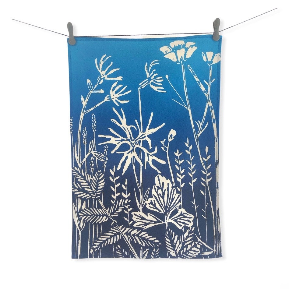 A gorgeous gift for someone who loves wildflowers and colourful kitchen accessories. A beautiful bright blue tea towel of a wildflower meadow - design taken from one of my original linoprints.